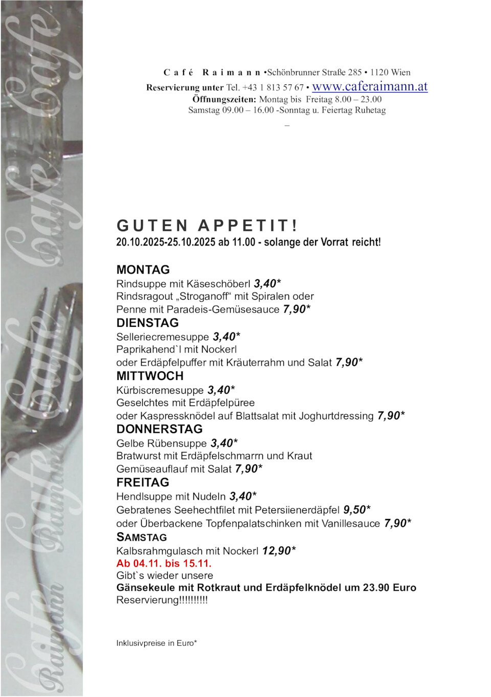 Das Café Raimann wird traditionsbewusst geführt, will aber auch den neuen Zeiten Rechnung tragen: Neben der klassischen Kaffeehauskarte gibt es auch zwei Tagesteller - eine herkömmliche und eine vegetarische Variante.